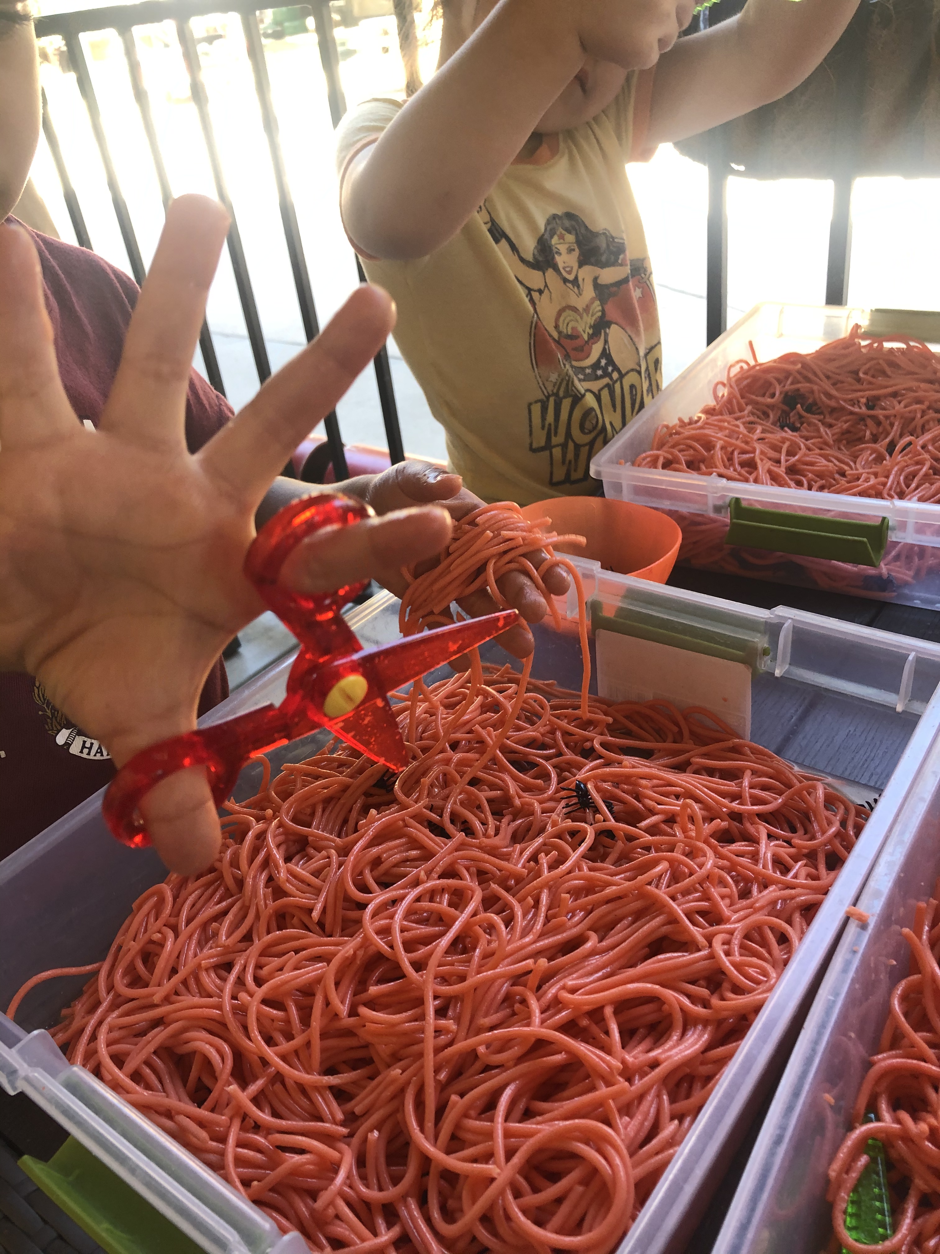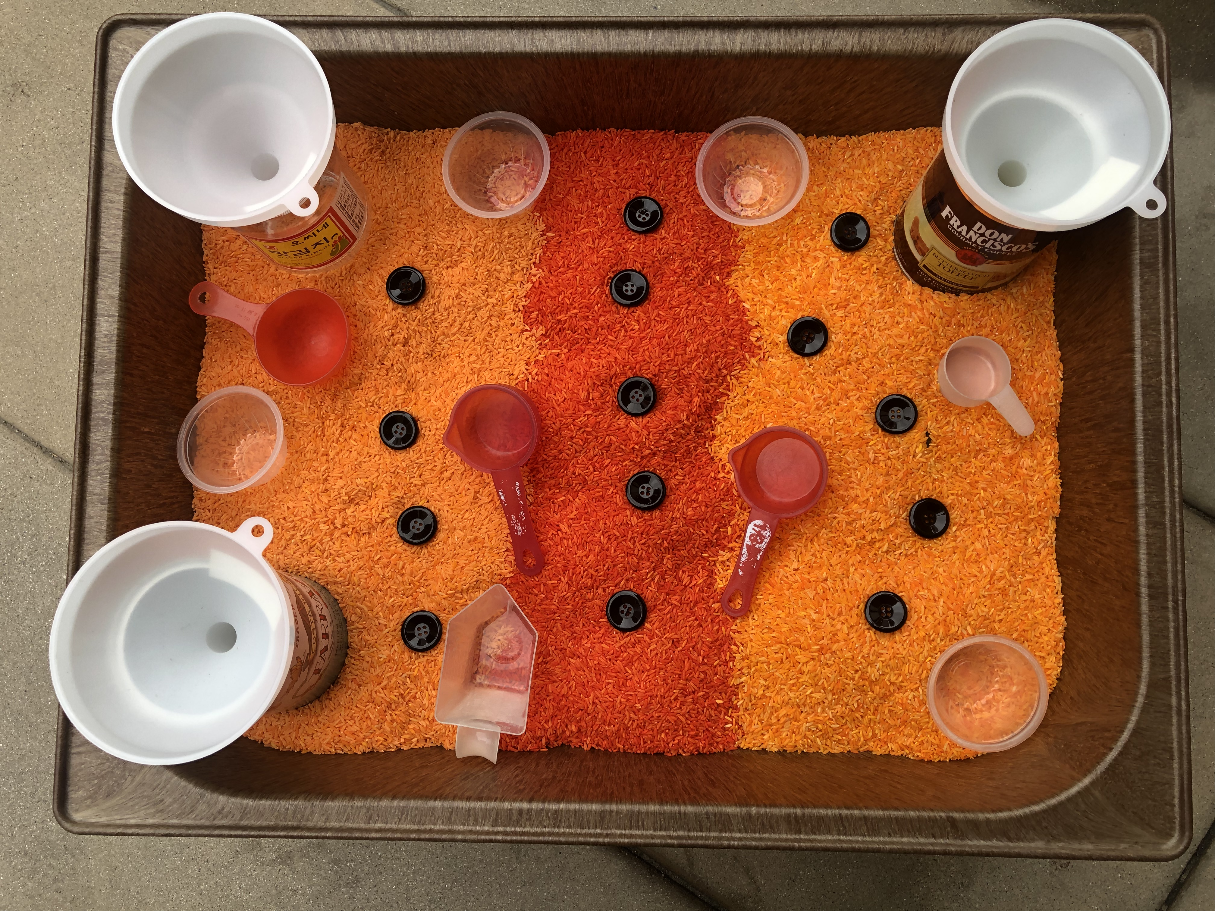 At this age, science is sparking curiosity, exploring textures, colors, cause and effect. We are giving our little ones early exposure to a wide array of tools to manipulate and move objects around–tools like safe scissors, tweezers, scoops and measuring cups.
