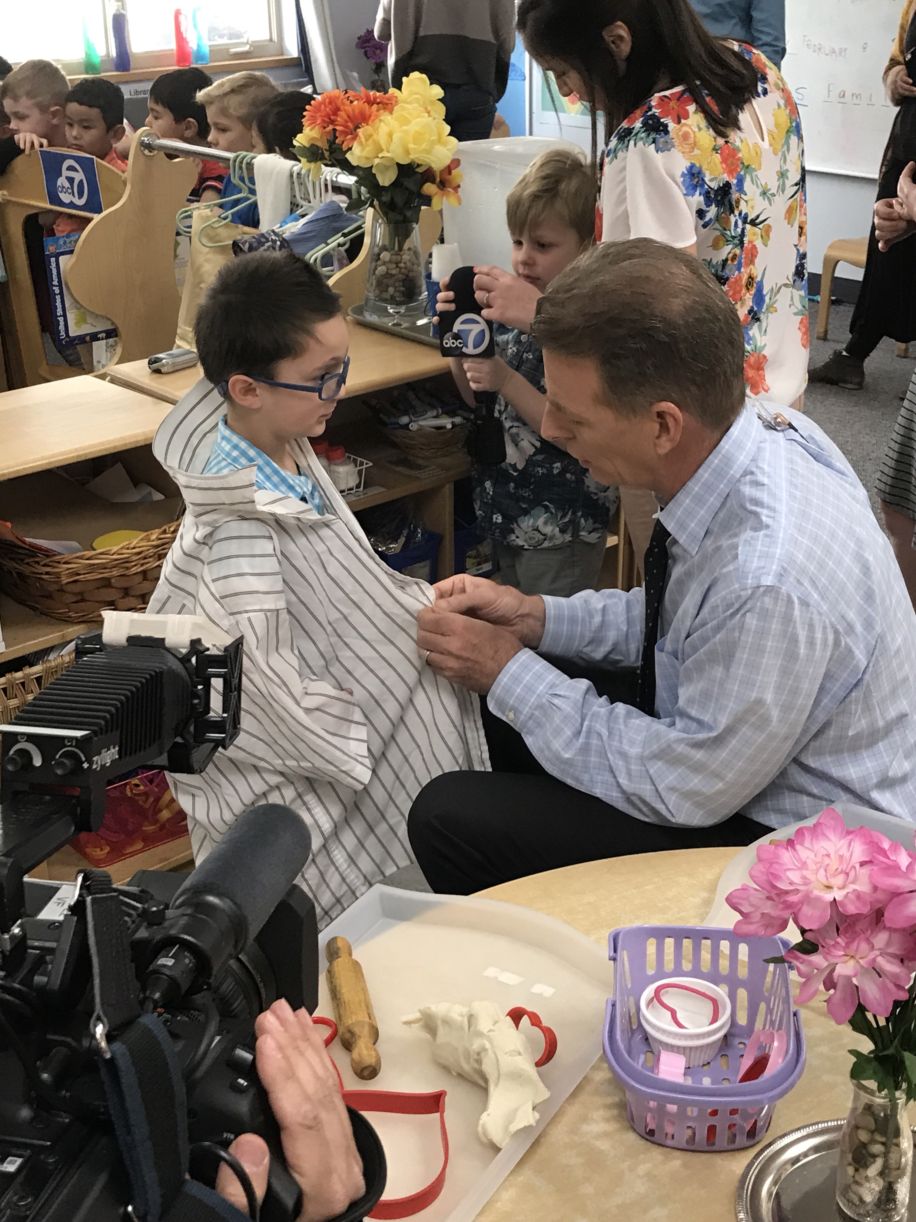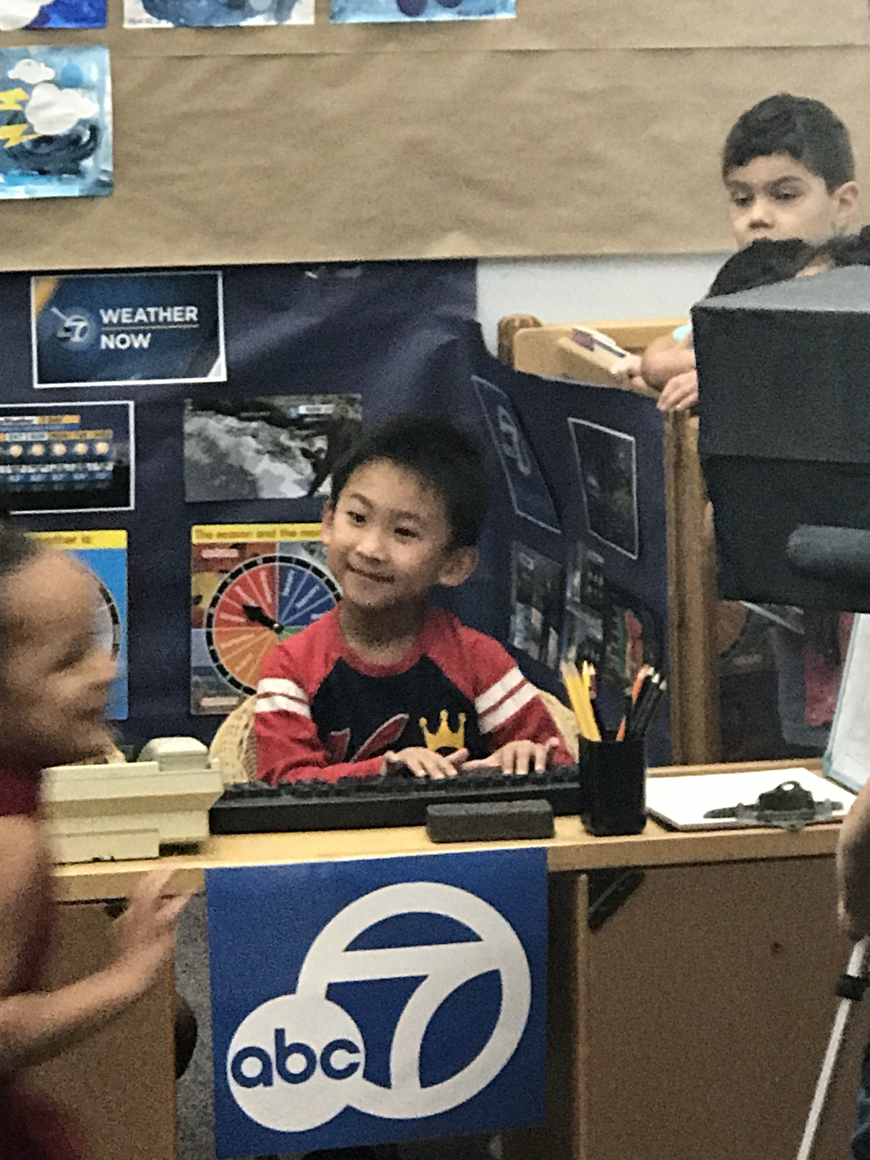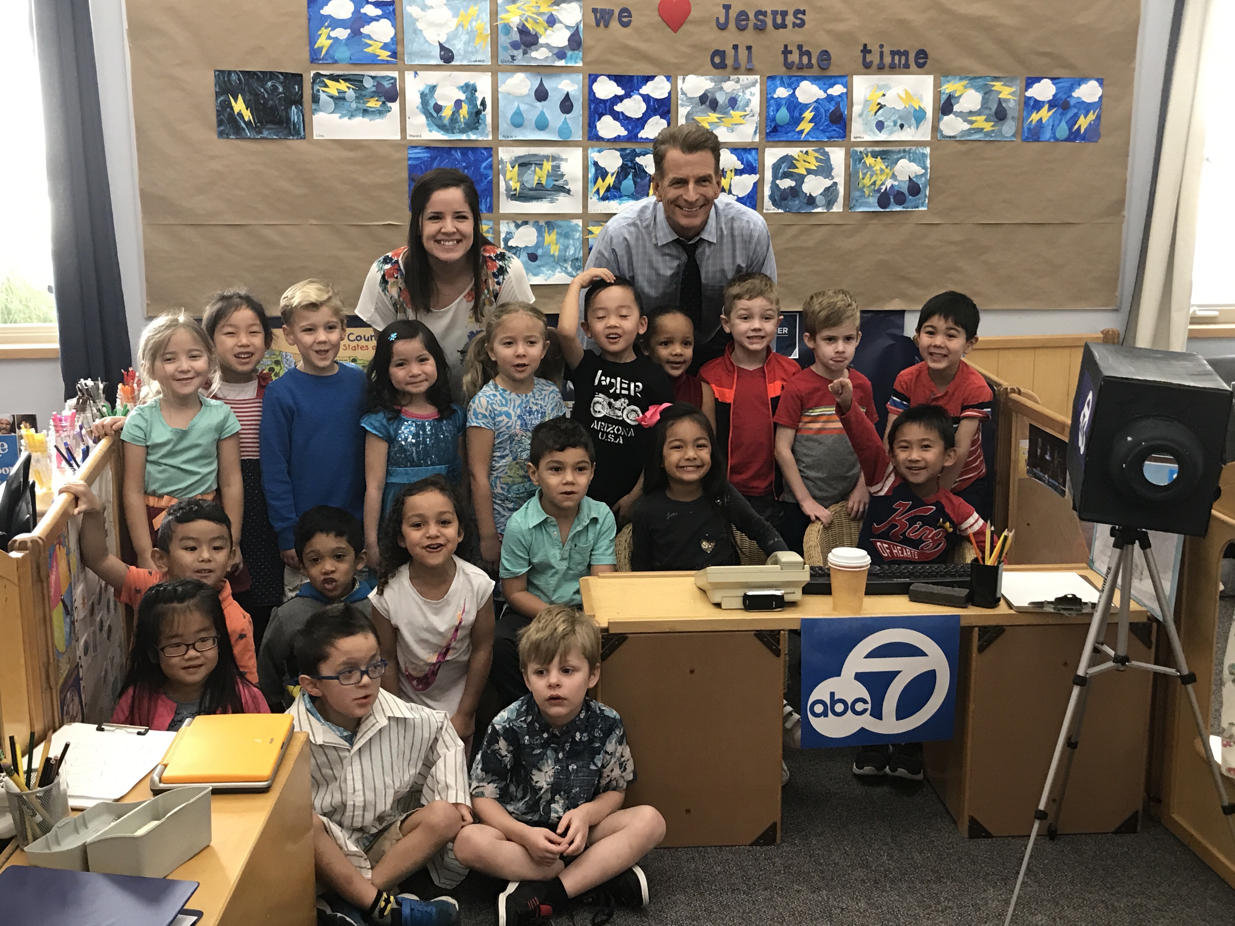 The students in Room 1 have shown a keen interest in news casting and weather reporting over the past few weeks, so the teachers set up an ABC7 themed news room in the dramatic play center. Much to our delight, Phillip Palmer offered to come and visit!!