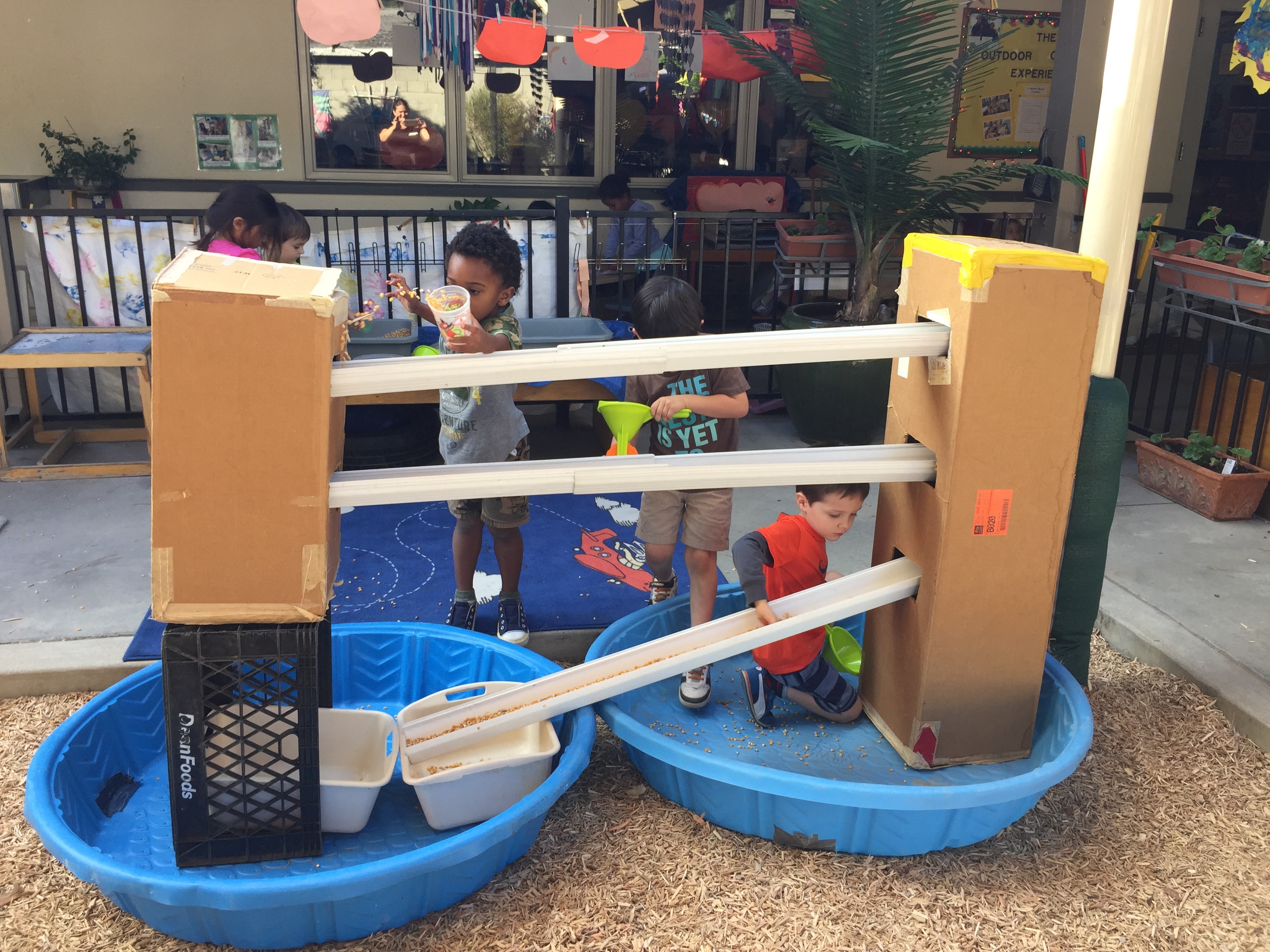Children in Room 3 spent countless minutes investigating the new multi-level sensory experience in the Outdoor Classroom during yard time today. Multiple children busily went back and forth, carrying cups and bowls filled with corn kernels over to the gutter ‘slides’. The corn rolled down the gutters, got pushed into the slot in the box, then fell to the next gutter to make its way down the line. Kids delighted as they prodded, pushed, scooped, and poured the corn. All of these activities create stronger connections in science as they learn measurement, gravity, engineering, and more.