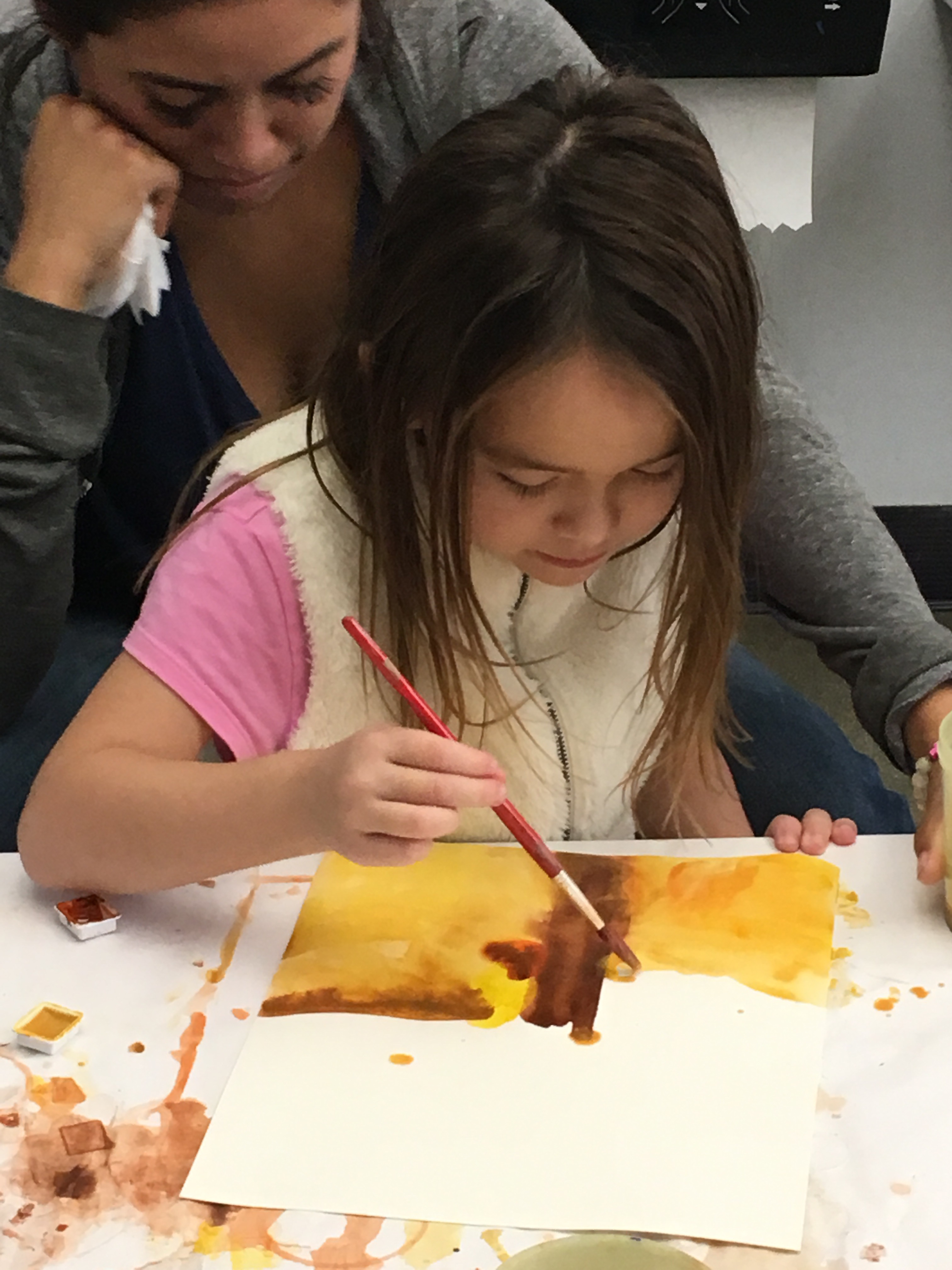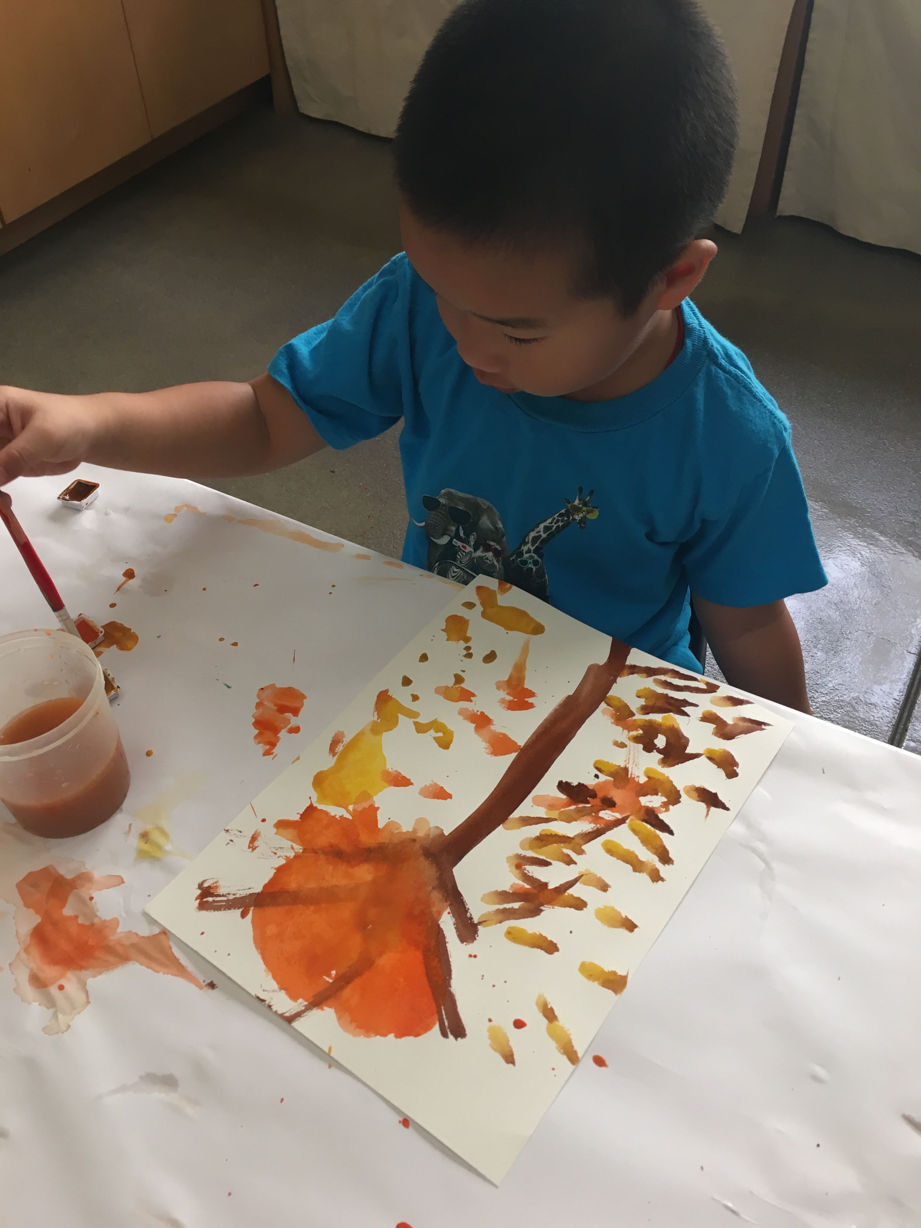 In the studio, we learned all about the season of fall. We questioned why the weather changes, why it gets darker earlier, the changes of the colors in the leaves and we also talked briefly about the other 3 seasons. We then looked at all the different types of trees. And talked about how every tree has different types of leaves. Unique to each tree type God has created. They then painted their very own fall tree watercolor painting…