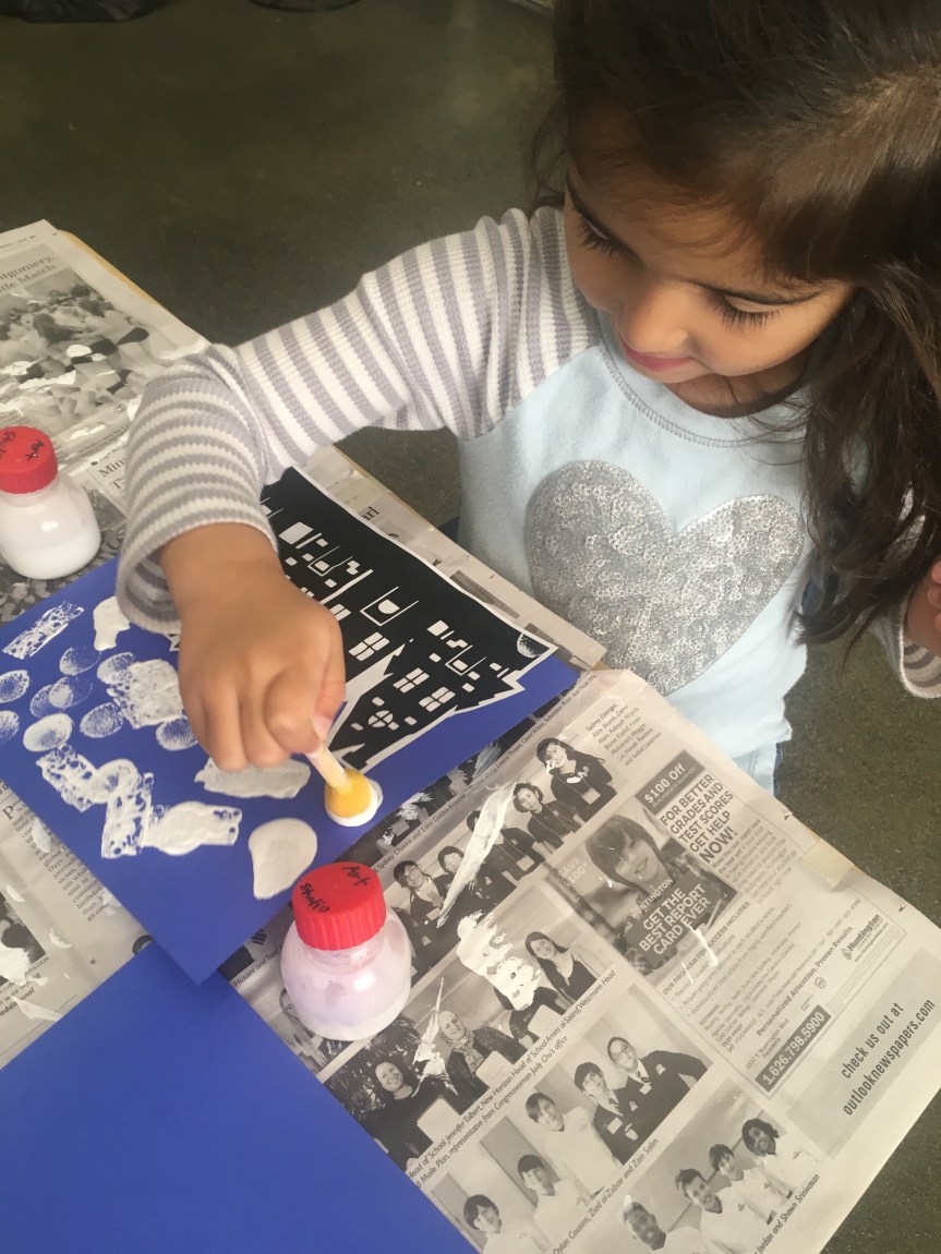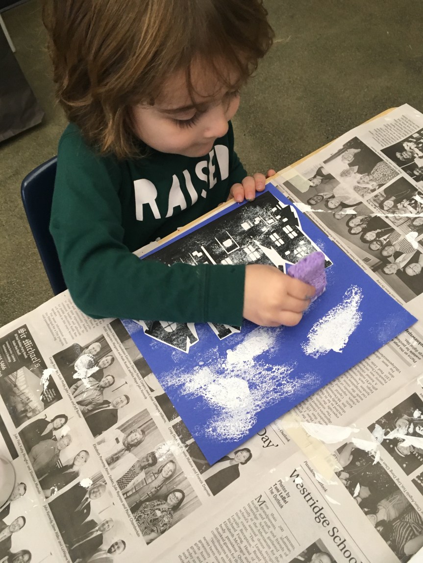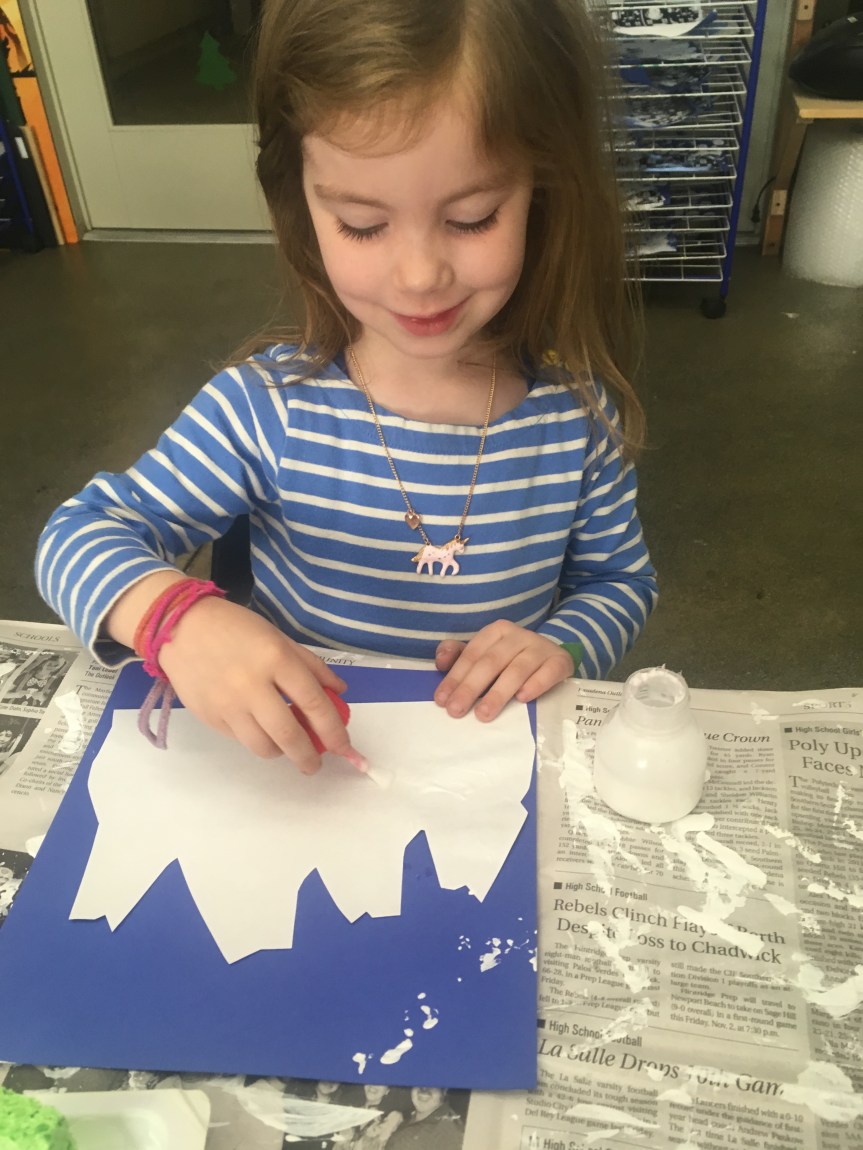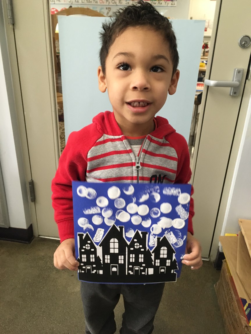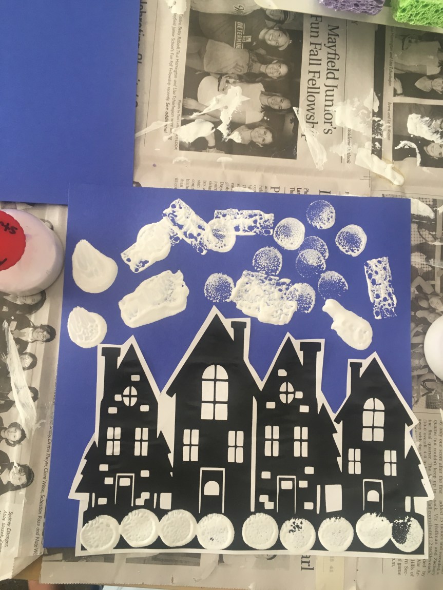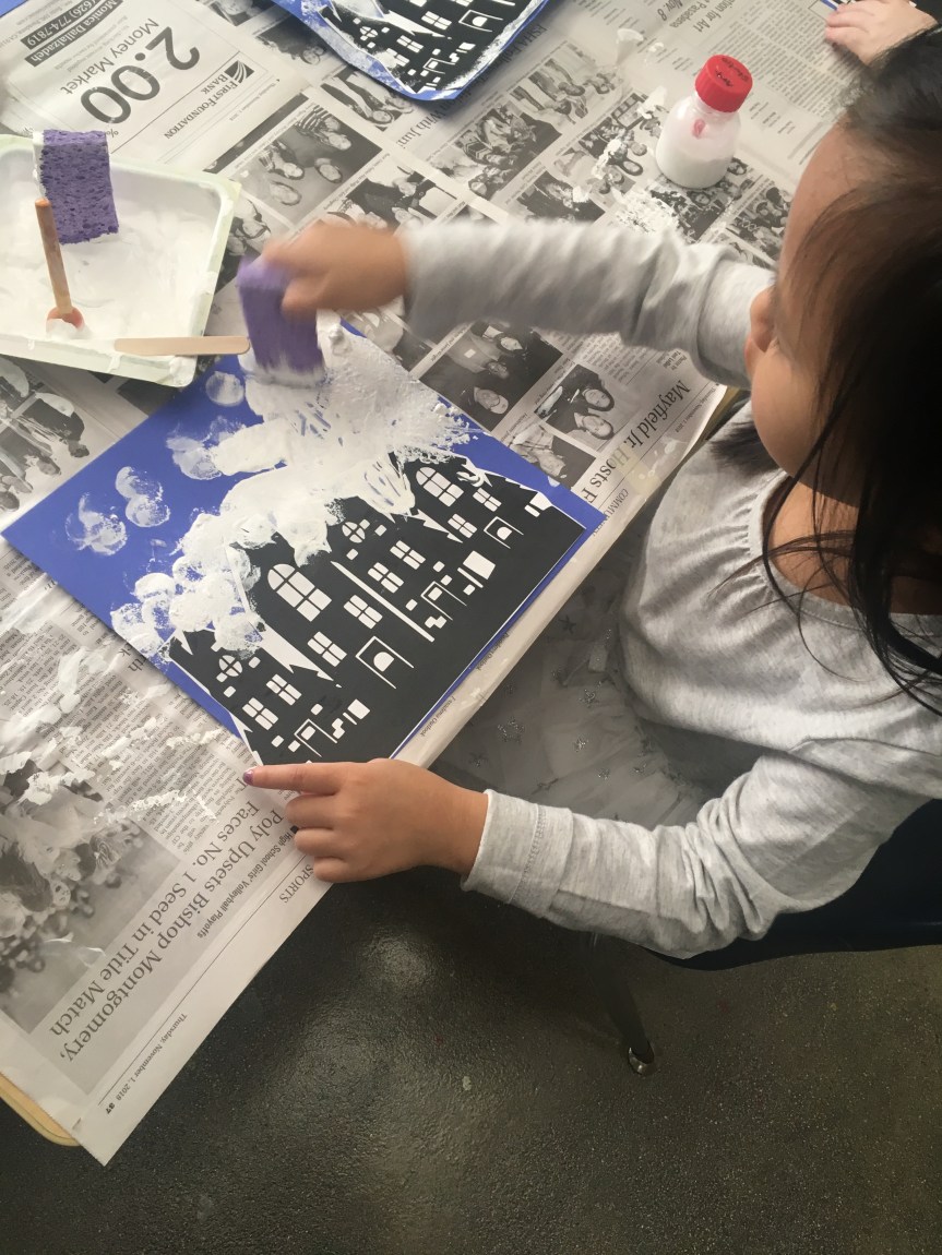 The students had such a fun time with this art project…painting “snow” onto the village to create a winter wonderland. We also shared stories about playing in the snow and going to the mountains. Some of our friends haven’t experienced the snow. I encourage you to take a day trip to go see some snow. We are blessed to live near the mountains…. 😉