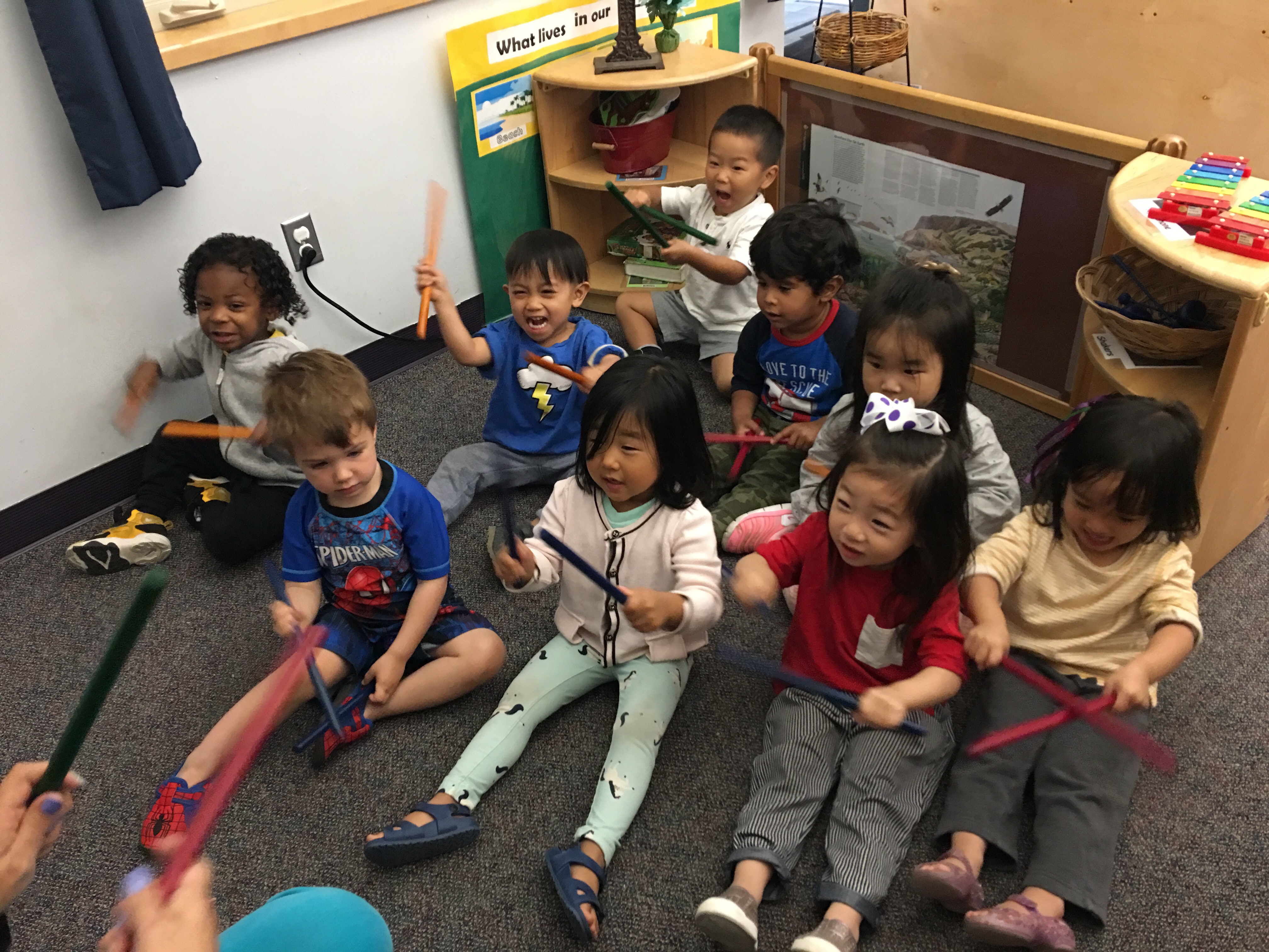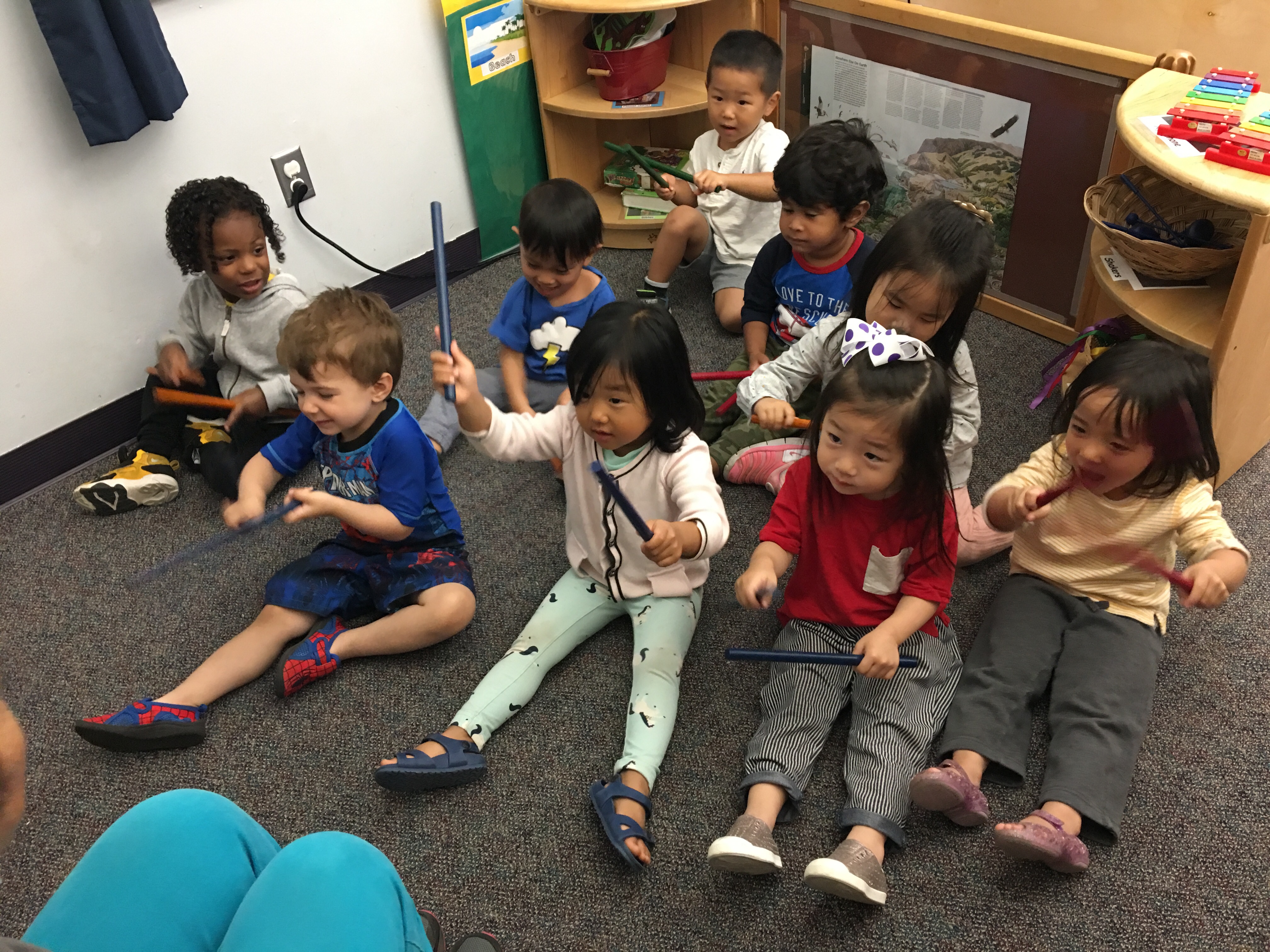 We are learning to listen and do by using rhythm sticks and the music CD by Hap Palmer. The children are getting really good at listening, following request, count the taps and keeping the beats.