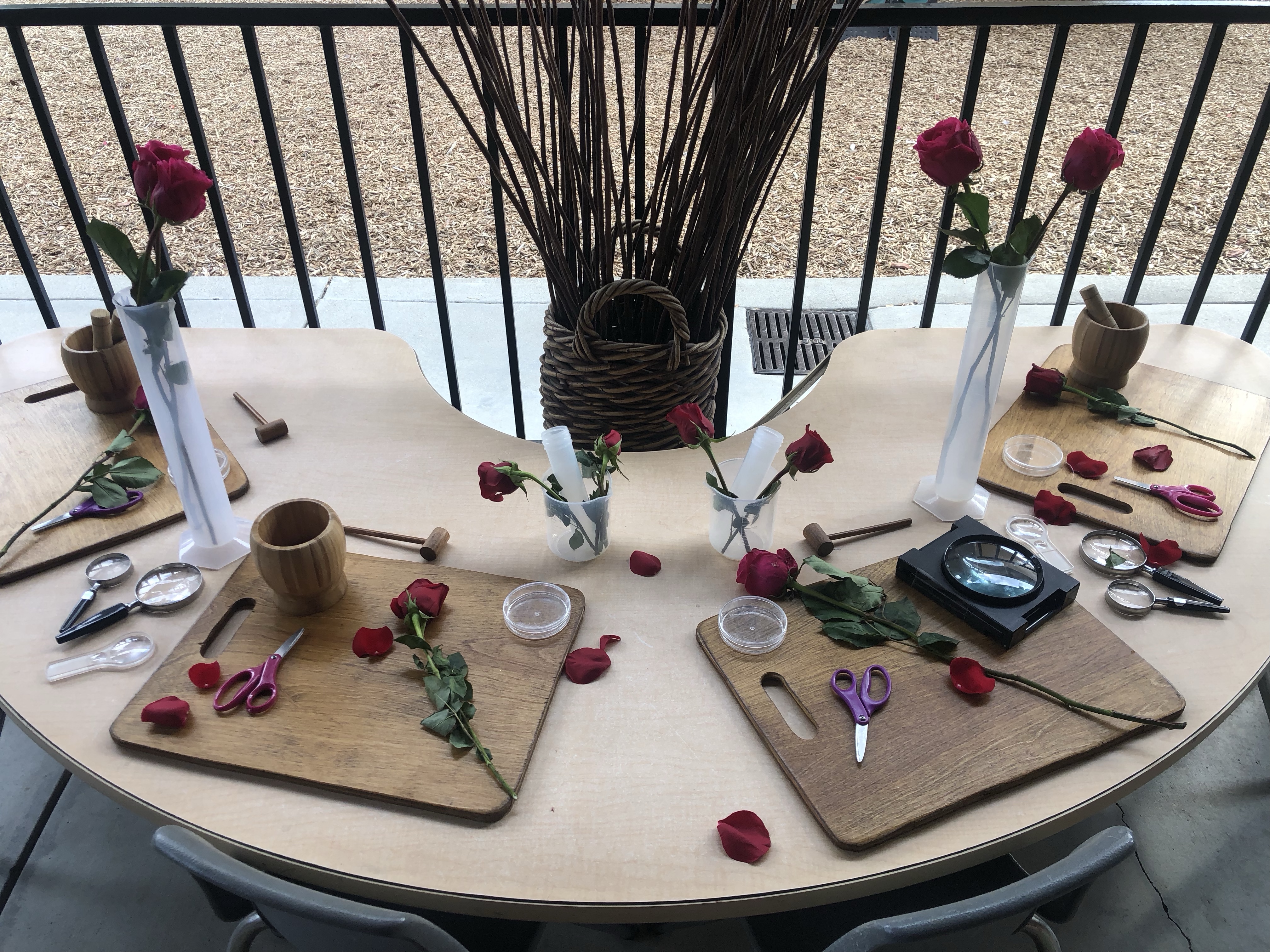 Room 1 was the first to arrive at this Valentine inspired activity. With interests peaked, our older 4 year olds began picking up the materials at this table. They were wide-eyed and curiously asked, “What do we do here?” and “What do we do with this?” With no adult direction, they started picking apart the flower petals, cutting the stems–dissecting the flowers! What better way to learn the parts of a flower than to be given the freedom to do what every child instinctually wants to do–take it apart to explore it! Of course with an activity like this comes the discussion of caring for nature so things can continue to grow. But in this moment and with these roses that have already been plucked from the ground, we are the ones growing–growing in our knowledge of the world around us, growing in life science, and growing in personal discovery.