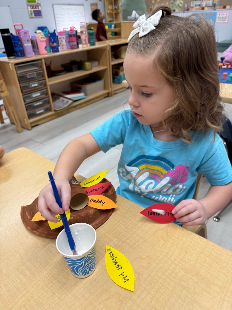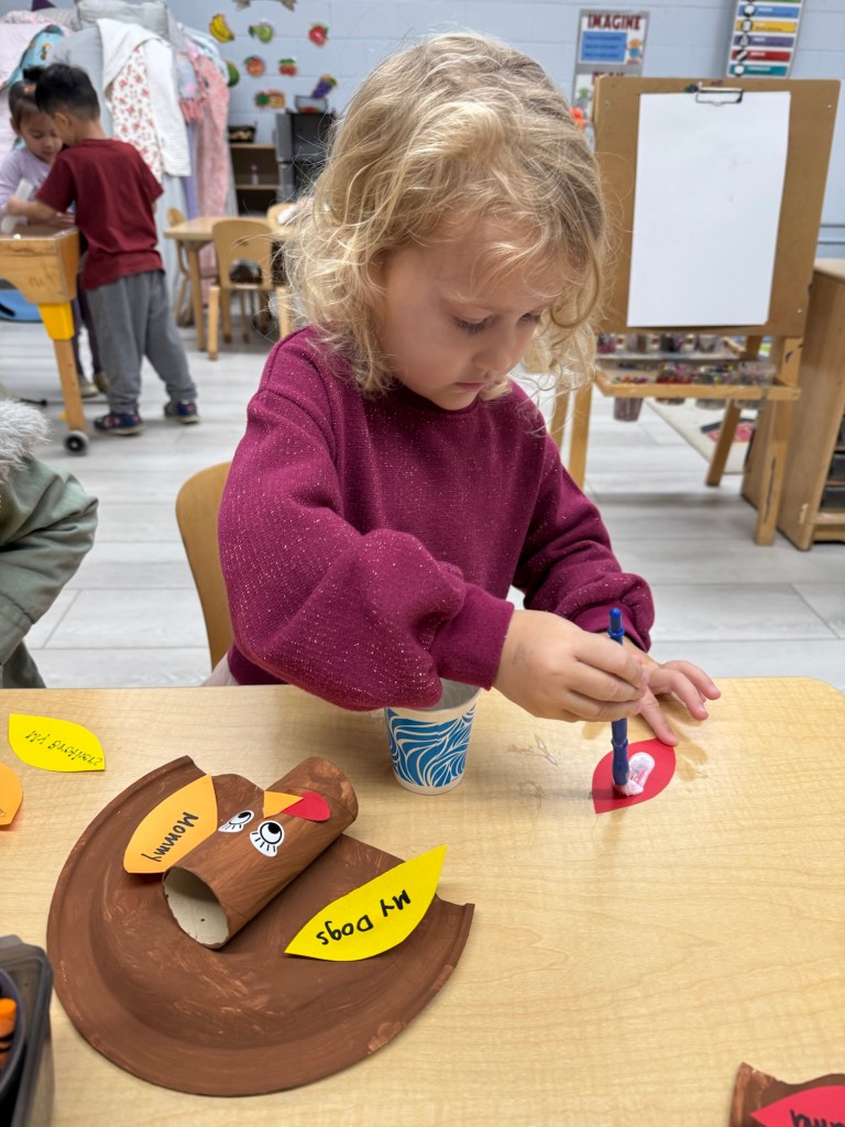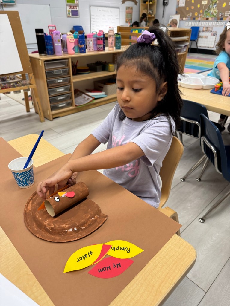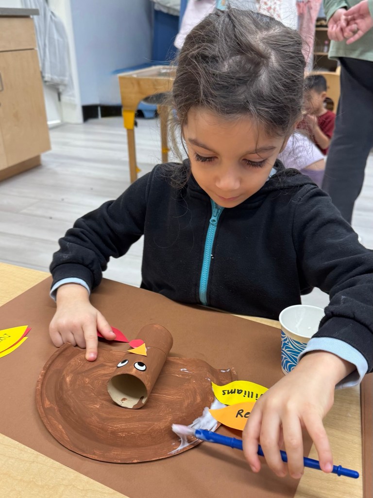 Our class created Thankful Turkeys! Each student used their fine motor skills to paint paper plates and cardboard tubes, which we let dry overnight. The next day, the teacher wrote down each child’s thankful thoughts on feather cutouts. Students then added feathers, a beak, a waddle, and sticker eyes to complete their turkey crafts. We invite you to stop by our classroom bulletin board to see what our class is thankful for. Here are a few pictures of our students working on their Thankful Turkeys!