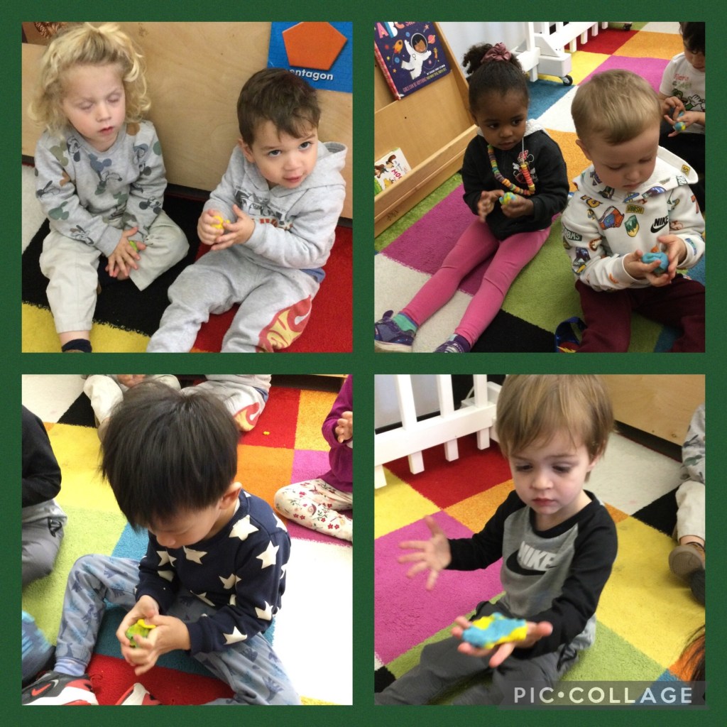 During circle time all the kiddos had a chance to hold little blue and little yellow, as they squeezed and rolled both colors together they were very excited about the different shades of greens.