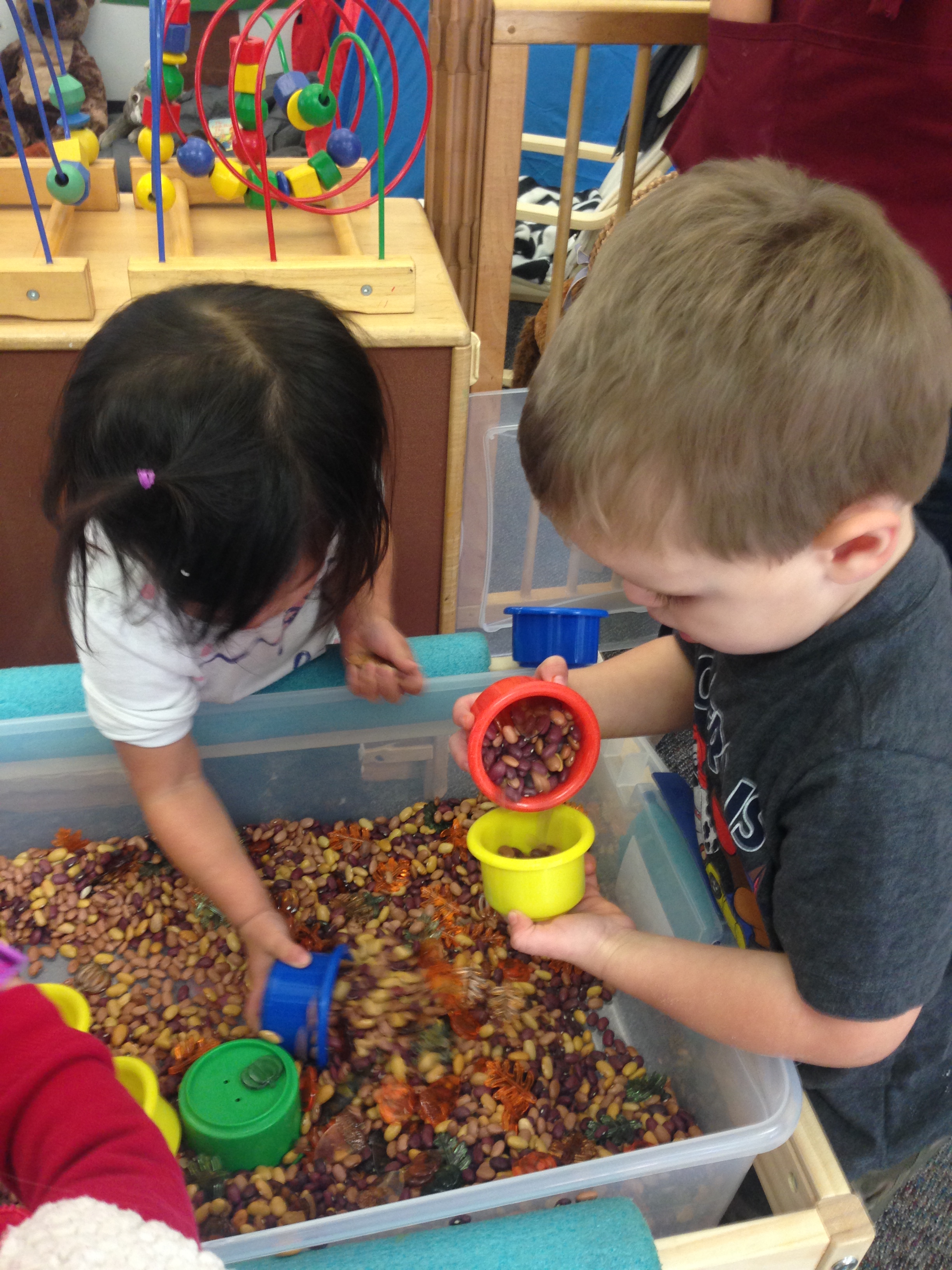 Room 5 has a new permanent sensory station, currently featuring multi-colored beans with autumn “jewels” and measuring cups. We scooped and poured as we compared and counted the amounts of beans and jewels in our cups.